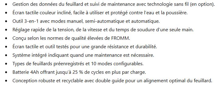 Le P329S est un outil de cerclage intelligent équipé d’un écran tactile couleur facile à utiliser, toujours visible pour l’opérateur. Il combine trois modes de fonctionnement (manuel, semi-automatique et automatique) dans un seul appareil, sélectionnables simplement sans changer d’outil. Son écran incliné protège contre l’eau et la poussière, prolongeant sa durée de vie. Grâce à ses réglages précis de tension, de vitesse et de soudure, il garantit un cerclage fiable et constant pour différents types de produits. Testé selon les normes de qualité strictes de FROMM, il peut également intégrer la technologie sans fil pour la programmation, les mises à jour et le suivi de maintenance.